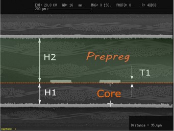 図2では、図1の図形化された図面ではなく、実際の材料の断面に置き換えられたものです、このH2例の部分は2枚のプリプレグが重ね合わされて使用されています。このサンプルのプリプレグは、プレス工程後のすでに硬化した状態のPCBのマイクロセクション断面です。H1の厚みは、図 1 で説明したように、材料メーカーのデータシートに記載された値をそのまま使用できます。H2の厚に関しては、プリプレグの樹脂成分が銅箔トレース間の隙間などのスペースに流れ込んだ後のプレス仕上げ工程後の厚さになります。これについて考えてみましょう – H2の値は、銅箔カバー率が高いほど大きくなり、銅箔カバー率が低いと小さくなります。図をごちゃごちゃにしないために省略されたパラメータ(アイソレーション距離)は、H2の値からT1の値を引いたものです。H2は、マイクロセクション分析の際に距離測定しやすい部分です。しかし、シミュレーションするためにH2の値を予測するには、基板設計者の知識が必要です。